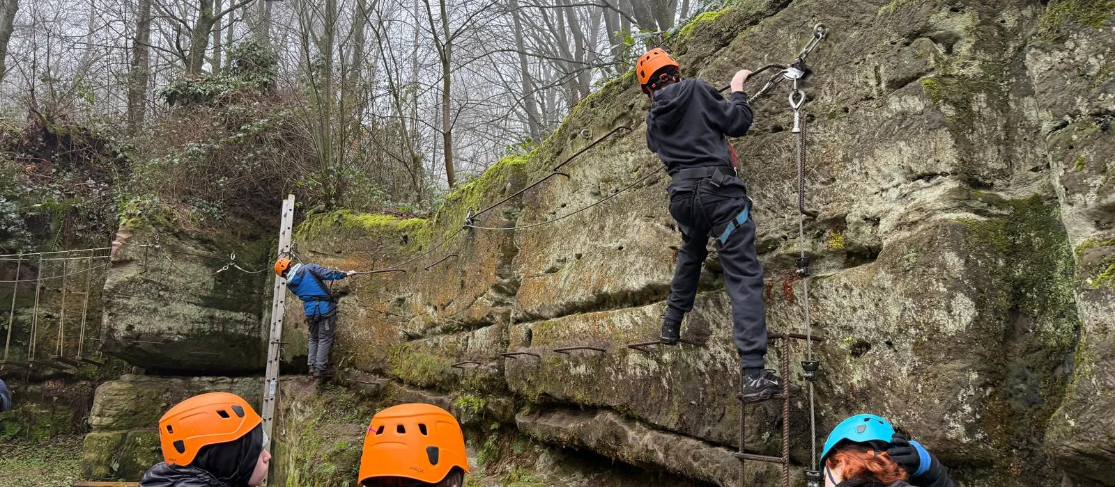 The route traverses the quarry rock face using fixed iron rungs and a continuous safety cable onto which participants clip their specialist Via Ferrata harness at all times. The route includes vertical climbing sections, traverses, and exposed but fully protected positions that create a genuine sense of alpine exposure. Qualified instructors guide the group through every step of the route with full safety oversight, and the smaller group sizes ensure a high-quality, attentive experience for every participant. Via Ferrata is one of very few such routes in the English Midlands, making it genuinely exceptional within the regional outdoor education landscape.